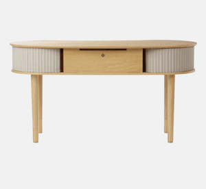 Audacious skrivebord er et tidløst møbel med detaljer som øker produktiviteten og rydder opp i arbeidsområdet. Den buede, organiske formen gir en nordisk eleganse, mens de skyvbare stofftamburdørene tilfører en moderne touch av nostalgi, og skaper en jevn overgang mellom fortid og nåtid.