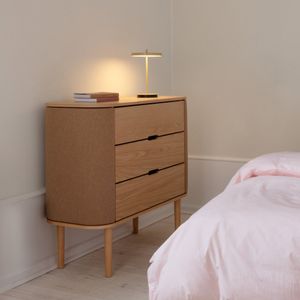 Treasures kommoden kombinerer eleganse og praktikalitet, med buede sider og romslige rom som gir en følelse av mykhet og raffinement til interiøret. Sidedørene åpnes som vinger, og tilbyr oppbevaring for smykker og små minner. Tre sømløse skuffer gir rikelig plass til strikketøy, servise eller kontorrekvisita.
